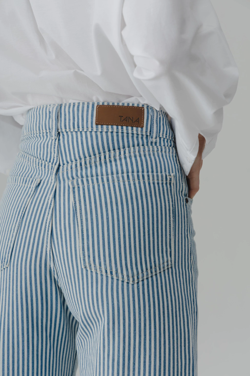 Nuestro Wide Leg Ellie es el jean que suma un toque distinto sin perder versatilidad. Su diseño con rayas finas en azul y blanco le da ese aire fresco y canchero que renueva cualquier look. Con tiro alto y pierna amplia, es ideal para crear outfits descontracturados con personalidad.